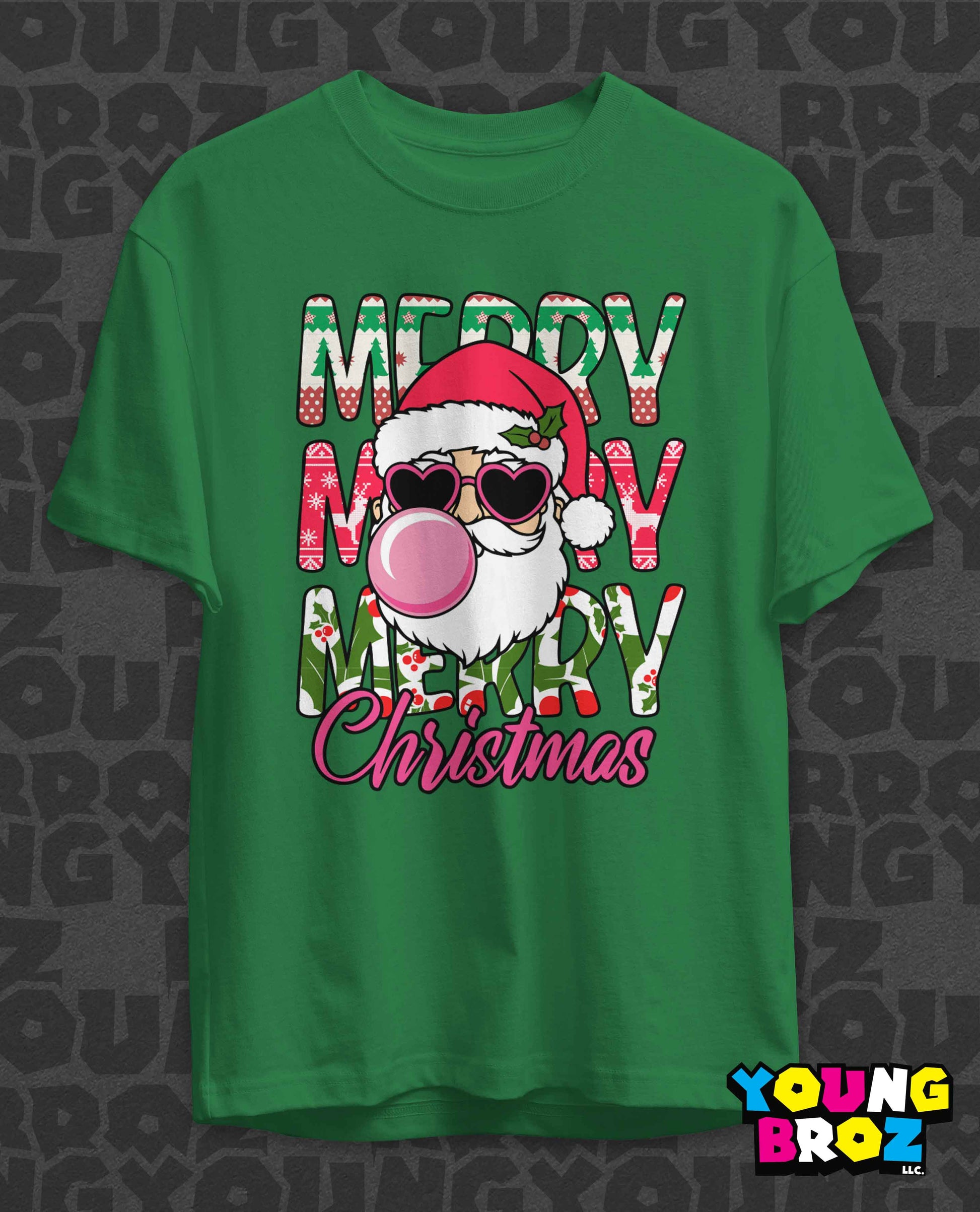 Make spirits bright (and stylish) with our “Merry Merry Merry Christmas” design — where Santa’s gone cool, calm, and cheerfully chaotic. Rocking heart-shaped shades and blowing a pink bubble, this jolly rebel brings attitude to the holidays. It’s festive, funny, and perfect for anyone who takes their Christmas spirit with a side of sass.