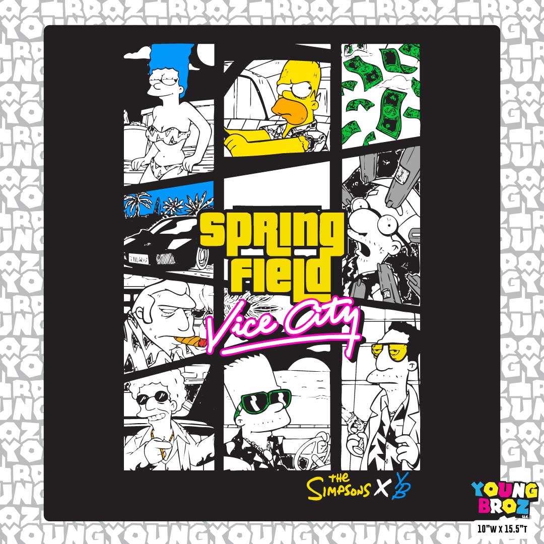 Welcome to “Springfield Vice City” — where palm trees, pink neons, and pure chaos collide. This crossover-style design fuses old-school cartoon nostalgia with Miami Vice grit, bringing a heatwave of attitude straight to your fit. Retro panels, bold color pops, and slick street flair make this tee an instant classic for those who live fast and laugh louder.